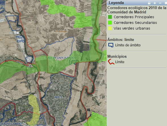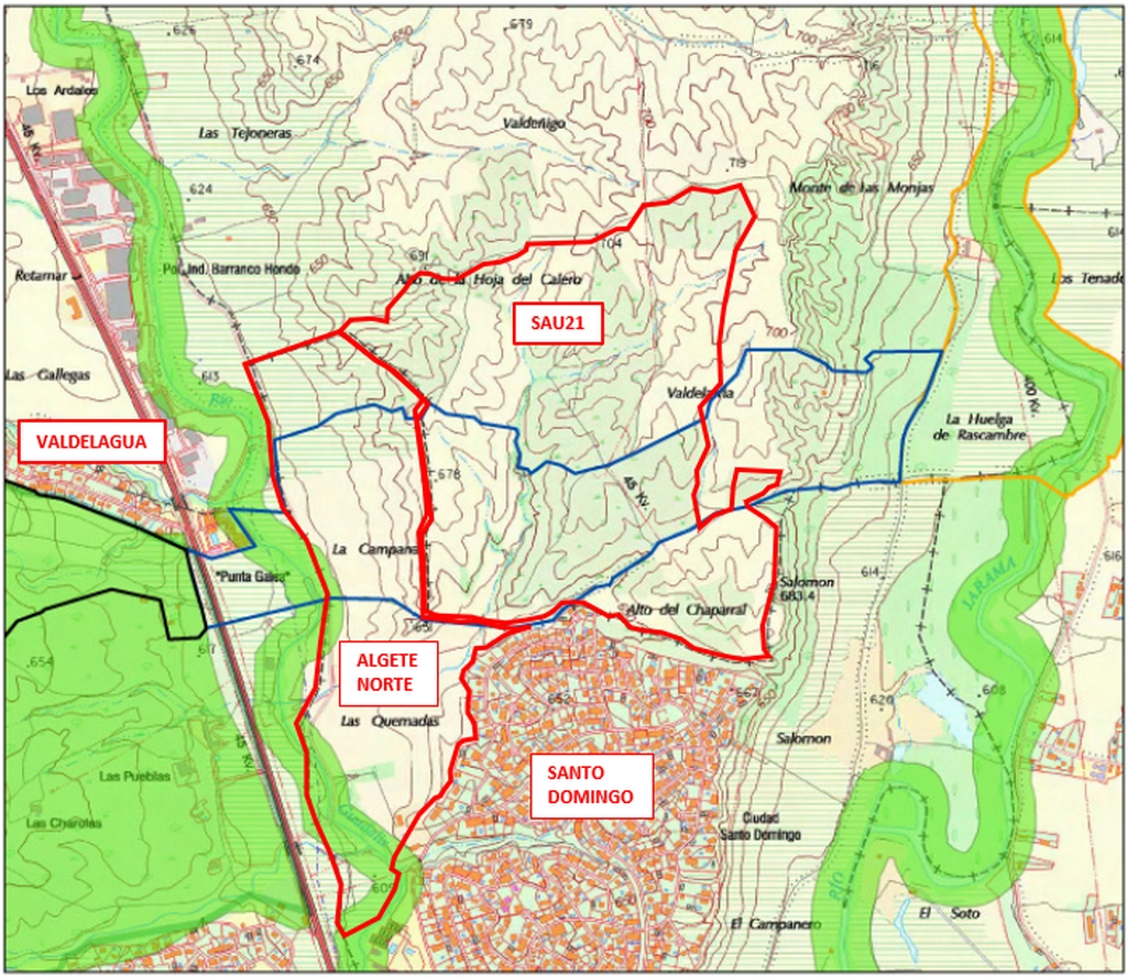 En la siguiente imagen, extraída de la resolución de la Comunidad Autónoma en 2010 en la que se creaban los Corredores Ecológicos, se aprecia la zona protegida del Corredor en azul, y hemos marcado en rojo los pretendidos desarrollos de Algete Norte y SAU21, junto al lindero norte de Santo Domingo: